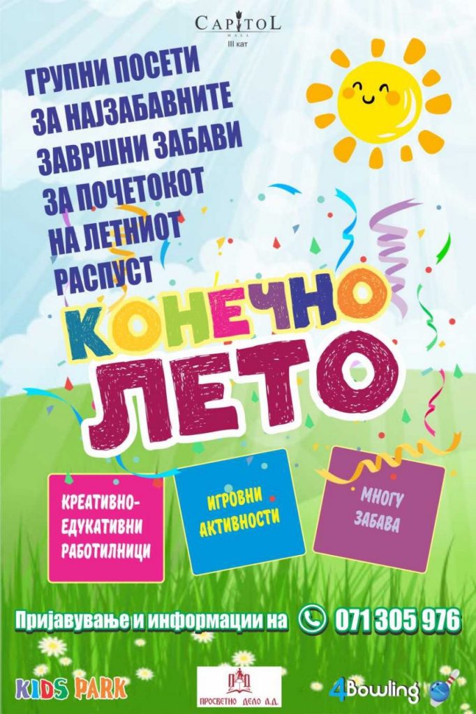 Kids Park & 4Bowling организира завршни забави за крајот на учебната година наменети за групни посети за деца од основно училиште и градинки. За сите ученици и наставници кои сакаат низ радост и забава да го прослават крајот на успешно завршената учебна година – најзабавните креативно-едукативни работилници на забавниот центар во Капитол Мол во соработка на Просветно […]