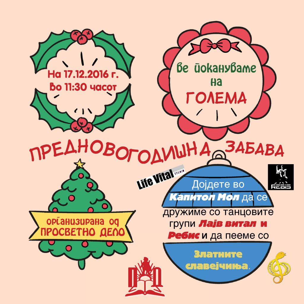 Оваа сабота (17.12) со почеток во 11:30 часот во организација на Просветно дело во нашиот трговски центар ќе се одржи ГОЛЕМА ПРЕДНОВОГОДИШНА ЗАБАВА!