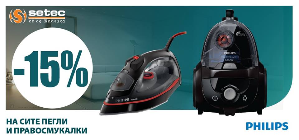 Во продажниот салон на Setec во нашиот трговски центар, се до 28 февруари, важи акцијата од 15% попуст на пегли и правосмукалки од брендот Philips.